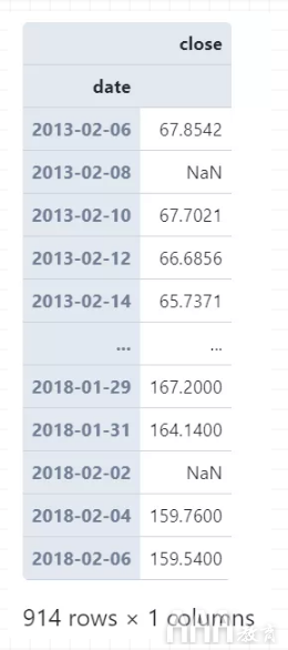 且resample()非常贴心之处在于它会自动帮你对齐到规整的时间单位上,譬如我们这里只有交易日才会有记录,如果我们设置的时间单位下无对应记录,也会为你保留带有缺失值记录的时间点:
