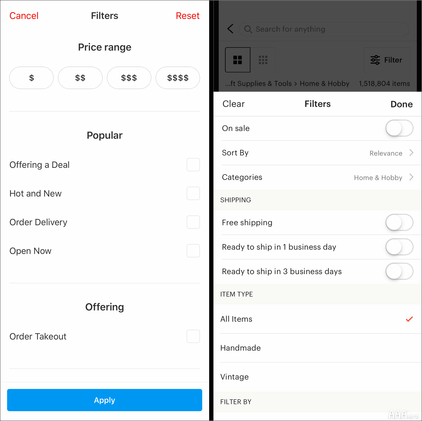 (左)Yelp:Cancel、Reset 和 Apply 这三个文本标签既直接又清晰,这样用户就不太可能不小心关闭视图而丢失他们过滤器中的选择。(右)Etsy:Clear 为用户取消提供了一种清晰的方式。而点击 Done 则返回到“产品列表”页,其中的选择已经应用。